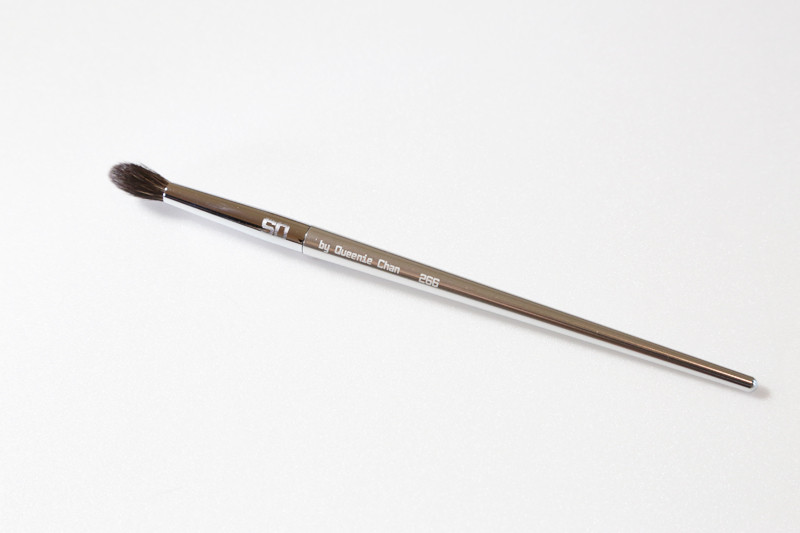 中型眼影融和掃. 採用最極品藍松鼠毛. 可以更好控制眼影的塗抺效果. 此眼影掃極為柔軟, 毛身為漸進式圓頂設計. SO 專業化妝掃由人手雕造, 採用最優質物料. 專利鋁製掃柄是為按摩面部而設, 連接毛及柄身的掃圈是採用優質黃銅.